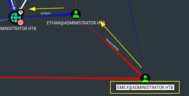 Since here and viewing these three users, the most interesting one is Emily so that she has GenericWrite in Ethan and Ethan hash DCSync to the Domain Controller.