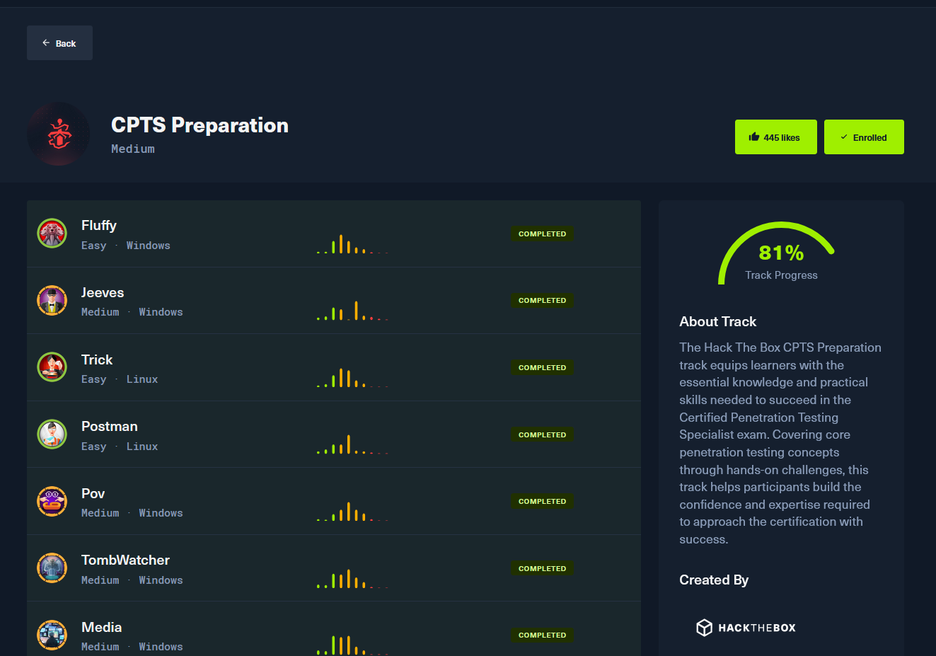This track is the official one created by HackTheBox. It will help you practice and reinforce concepts within the CPTS scope, although there are also machines that introduce concepts outside the scope.