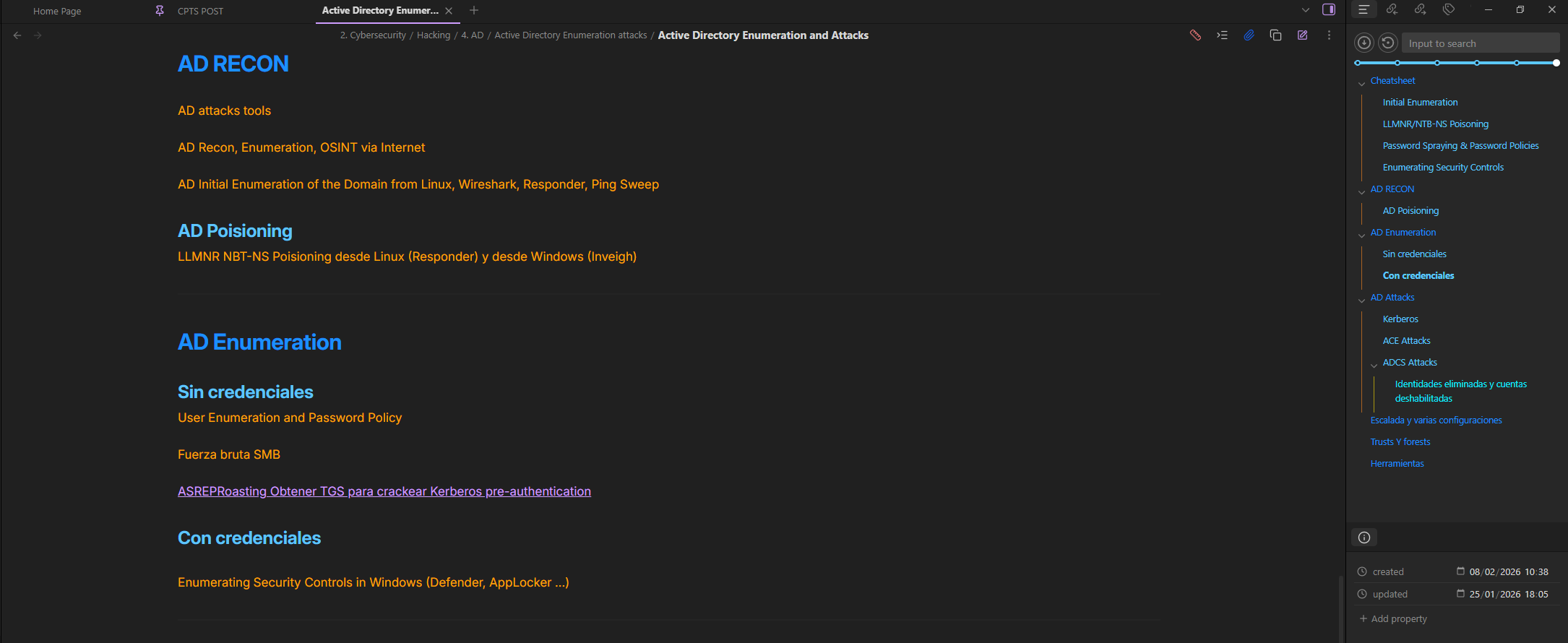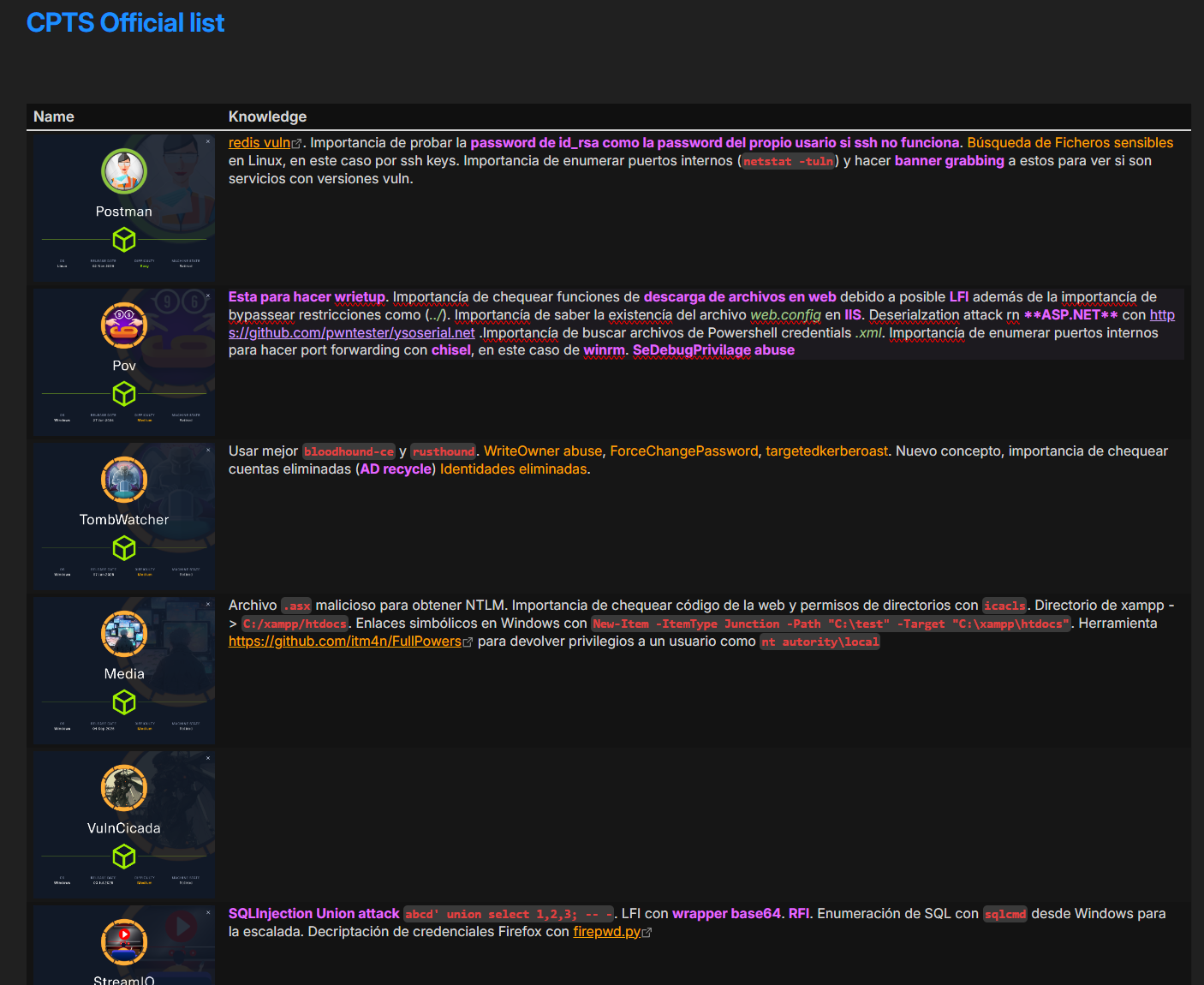 Ahora bien, mejora tus notas y cheatsheets con todo lo que vayas aprendiendo mientras que completas los labs. Yo tenía una página en donde apuntaba las máquinas que iba haciendo y lo que aprendía de ellas