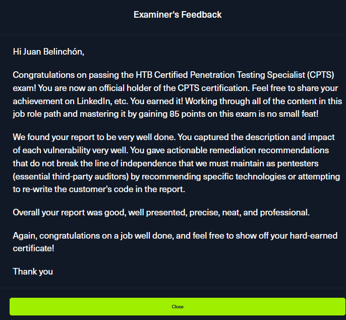 La CPTS me parece una certificación que realmente se asegura que puedas cumplir en un puesto de trabajo como pentester. No solo por la manera de pensar que adquieres, sino también por las reporting skills, ya que al fin y al cabo el producto final en un pentest es el reporte y ellos se aseguran que tienes las habilidades y aptitudes necesarias para desarrollar un reporte profesional a la hora de corregírtelo.