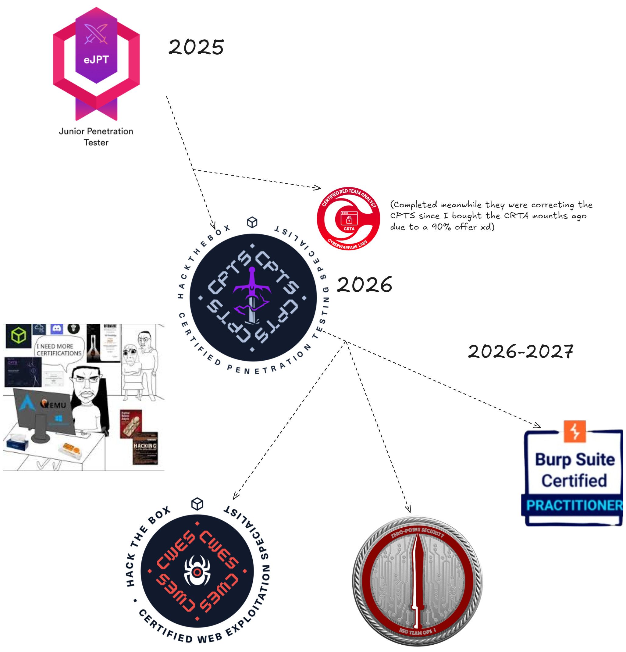Después de haber conseguido la CPTS, me gustaría formarme en read team, sin embargo pienso que mi punto debíl es hacking web, por lo que no lo quiero dejar de lado. Después de esta positiva experiencia con HackTheBox y ya teniendo la PATH de la CWES al 64%, es posible que me presenta a ella antes de que comience el verano. Como sea, seguiré formándome y haciendo laboratorios, las certificaciones que tengo en mente para el resto del año y comienzos de 2027 son las siguientes: